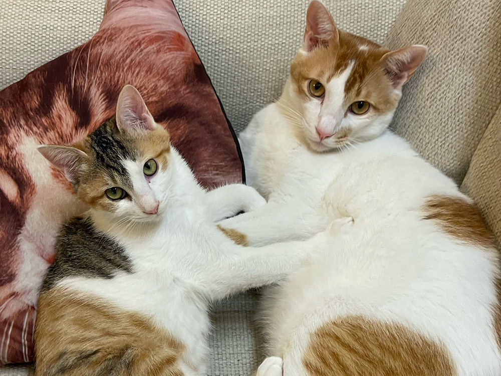 1歳の猫も最初は警戒していましたが、今では寄り添って、追いかけっこをしたり、一緒にくっついて眠ったり、おだやかな気持ちで過ごしています。