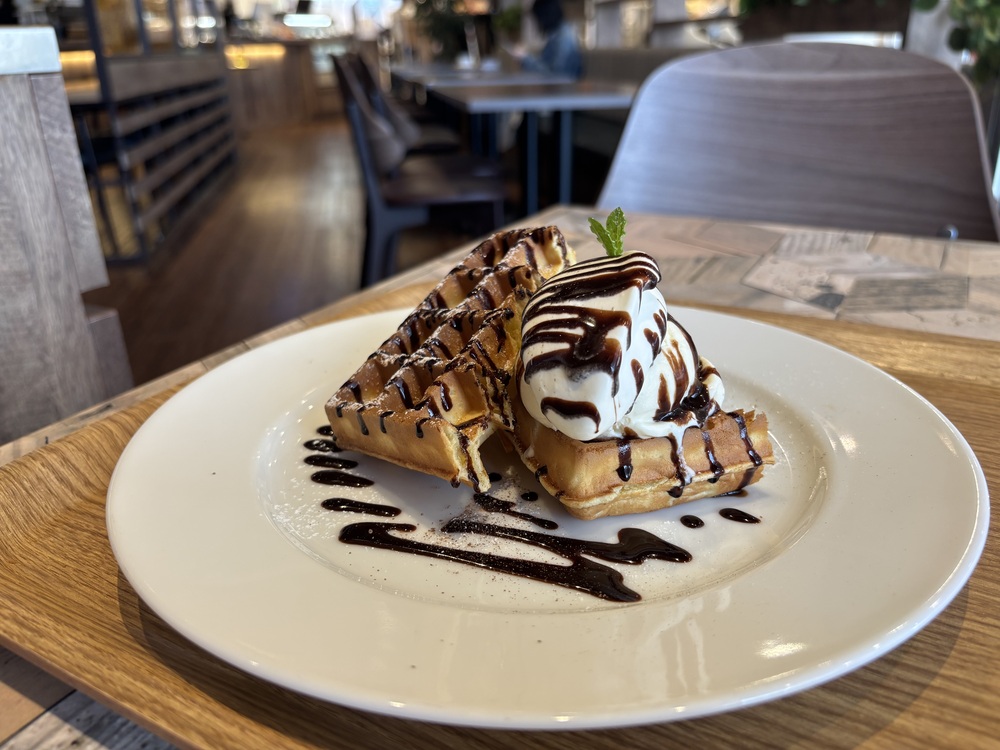 甘さ控えめなクリームと、濃厚なバニラアイスの相性が抜群なのと、なりよりワッフルの生地の表面のカリッと感がくせになるおいしさでした。