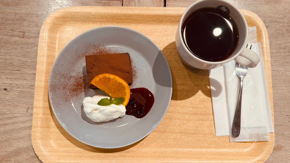この日は、「ショコラデモーツァルト」と「本日のケーキ」をブレンドコーヒーとのケーキセットでいただきました♪