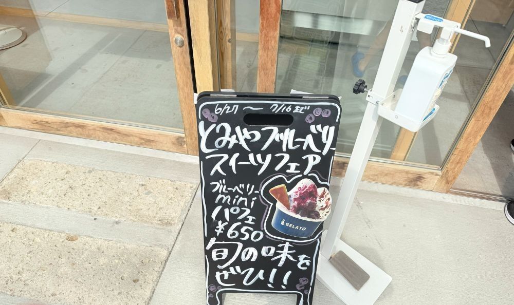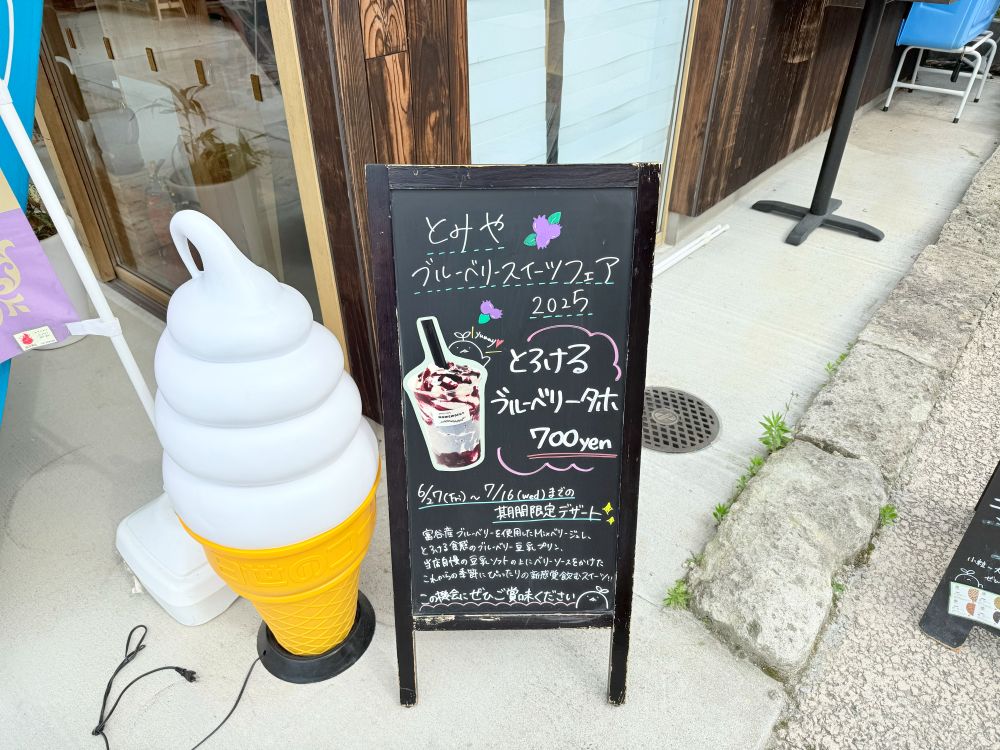 店頭の手書き看板によると、こちらのパフェには旬の富谷産ブルーベリーが贅沢に使用されており、見た目も華やか。