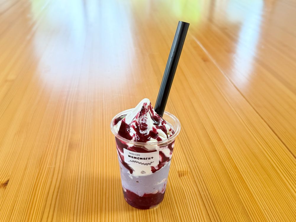 「タホ」とは、フィリピン発祥のスイーツで、甘いシロップと豆乳プリンのような食感が特徴。mamemaru+の「とろけるブルーベリータホ」は、ブルーベリーピュレ、ジュレ、ソースに豆乳ソフトクリームを重ね、食感と味わいの層が重なるよう工夫されています。特に、果実感のあるブルーベリーのソースと、やさしい甘さの豆乳ソフトのバランスが絶妙です。