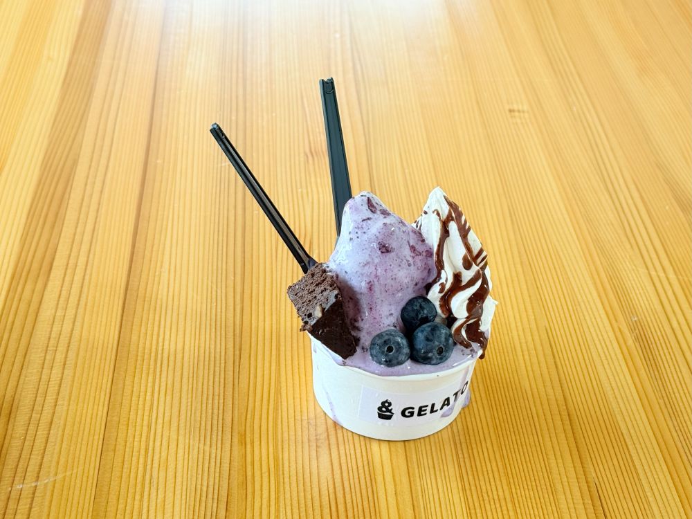 実際にいただいたところ、ブルーベリーのジェラートは甘さ控えめで果実の酸味がしっかりと感じられ、チョコソースやホイップクリームとの相性も抜群でした。さらに生のブルーベリーやブラウニーもトッピングされており、見た目の楽しさと食感の変化がうれしい一品でした。