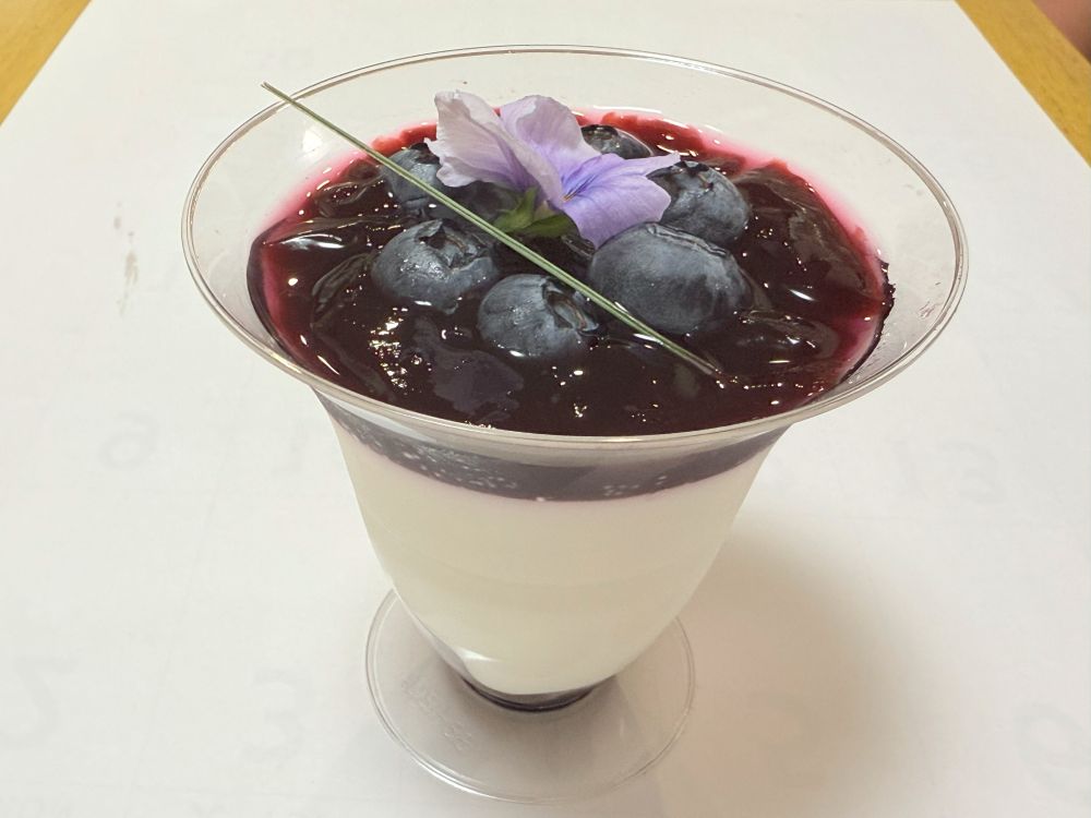 まず印象的だったのは、真っ白なムースにブルーベリーソースと生の実をたっぷりとあしらったカップデザート。ソースの濃厚さとムースのふんわり感が絶妙で、見た目にも涼しげです。
