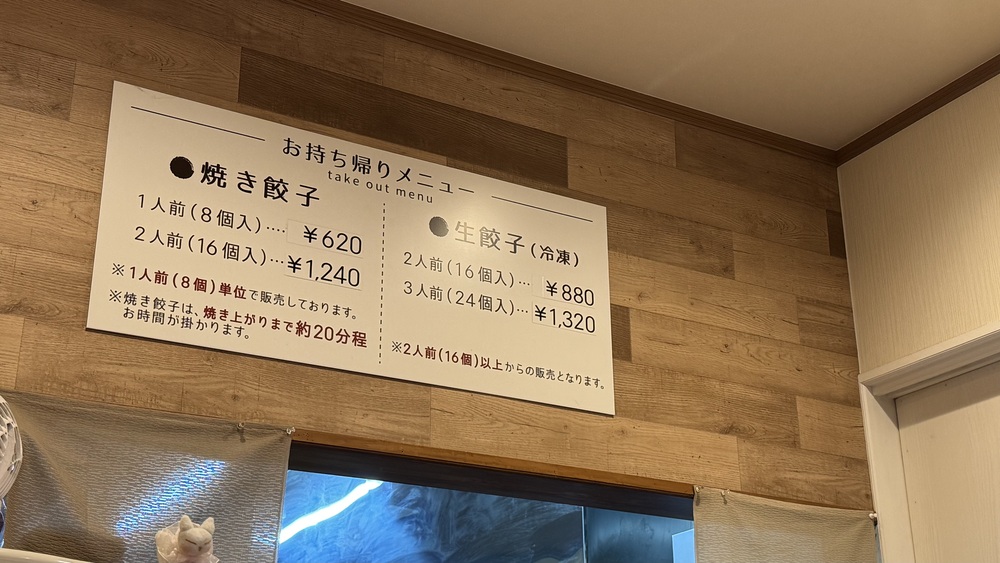 お持ち帰りのメニューは焼き餃子と生餃子(冷凍)の二種類。