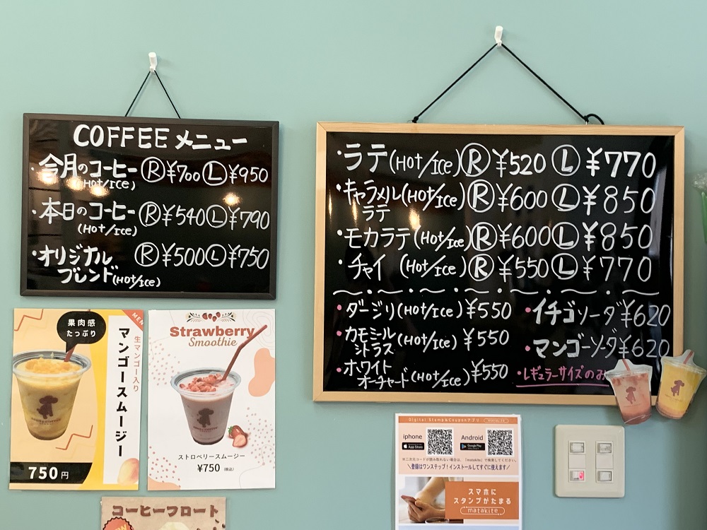 メニューボードには、「本日のコーヒー」、「今月のコーヒー」、「オリジナルブレンド」だけではなく、コーヒー以外のメニューもたくさんあります。