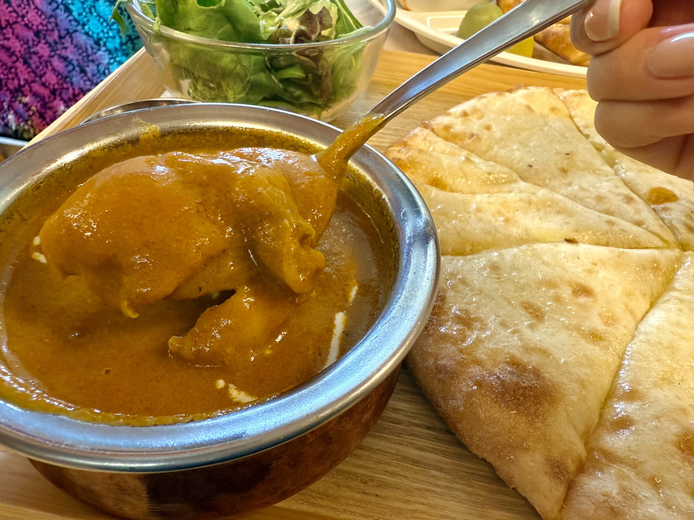 じっくり煮込まれたチキンはやわらかく、スプーンでもホロホロとほどけるほど。スパイスの香りはしっかりしつつも、口当たりはまろやかで、辛さレベルを調整できるので安心して楽しめます。