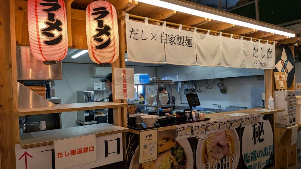 「だし廊SaKaNa塩釜仲卸市場店」で、市場の活気の中で海の旨味が凝縮された、魚だしラーメンと貝だしラーメンを味わってみてください。