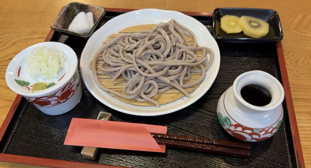 薬味は、おろしわさび・ねぎ・大根のお漬物、そしてフルーツにキウイとゴールドキウイが添えられていて、シンプルながら丁寧さが感じられる盛りつけも好印象でした。