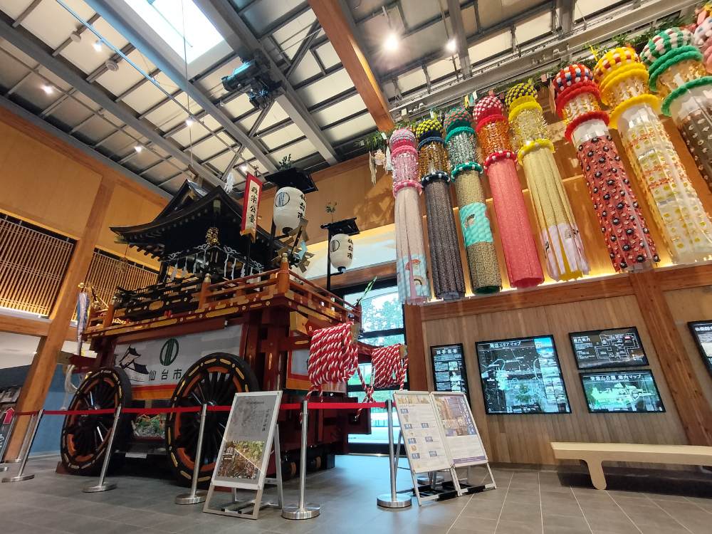 館内では、「仙台・青葉まつり」の山鉾(やまほこ)や「仙台七夕まつり」の七夕飾りなどが展示されており、仙台の祭り文化を肌で感じられるのも魅力。