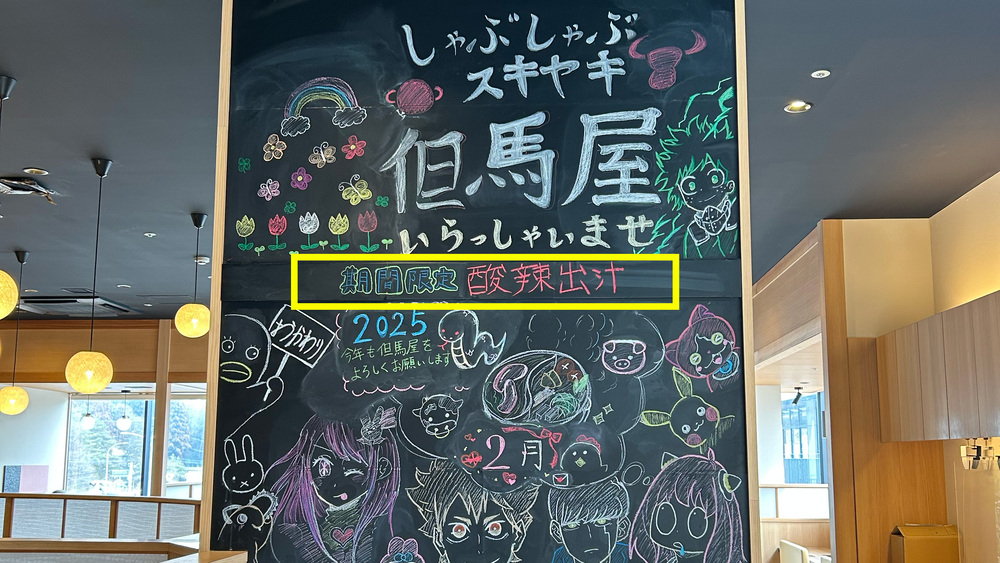 たくさんのかわいい絵にまぎれて、期間限定の出汁のご案内があります!入店時にぜひご確認ください。