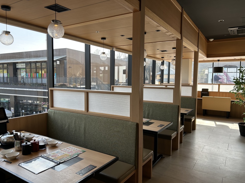 郊外のため、アクセスは主に車ですが、大きい商業施設に入っており、駐車場はたくさんあるのでご安心ください。