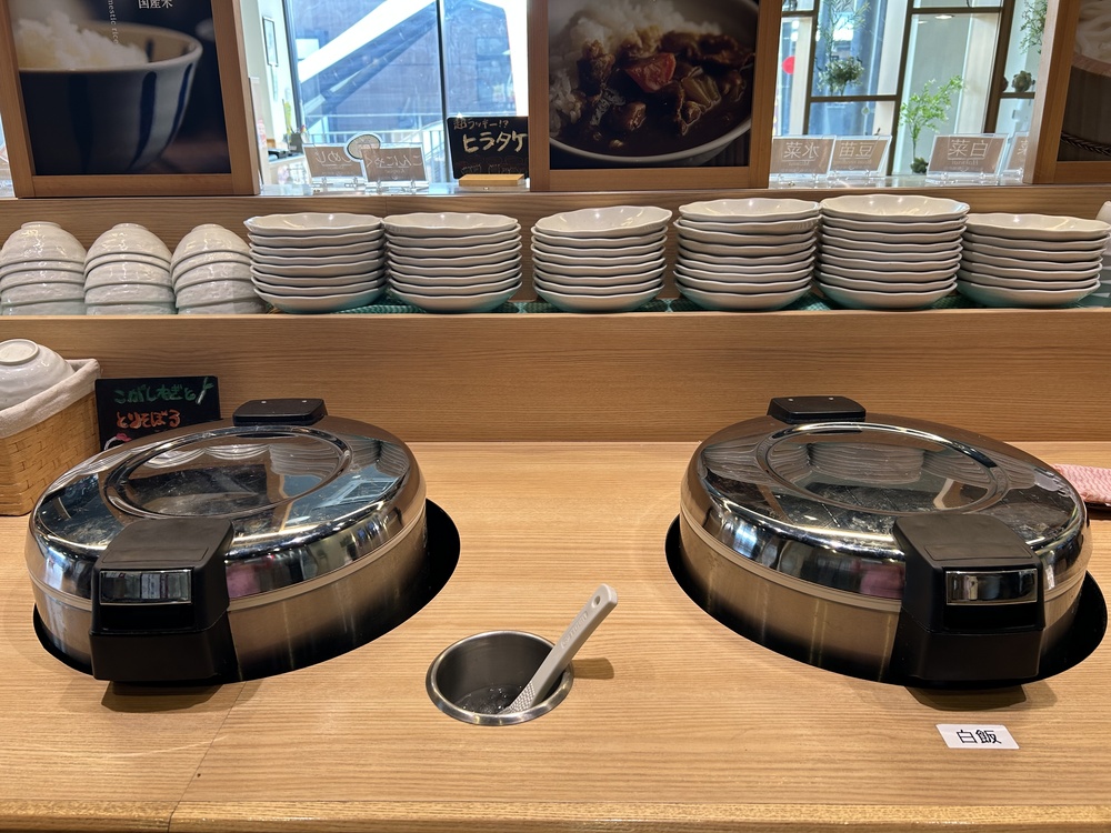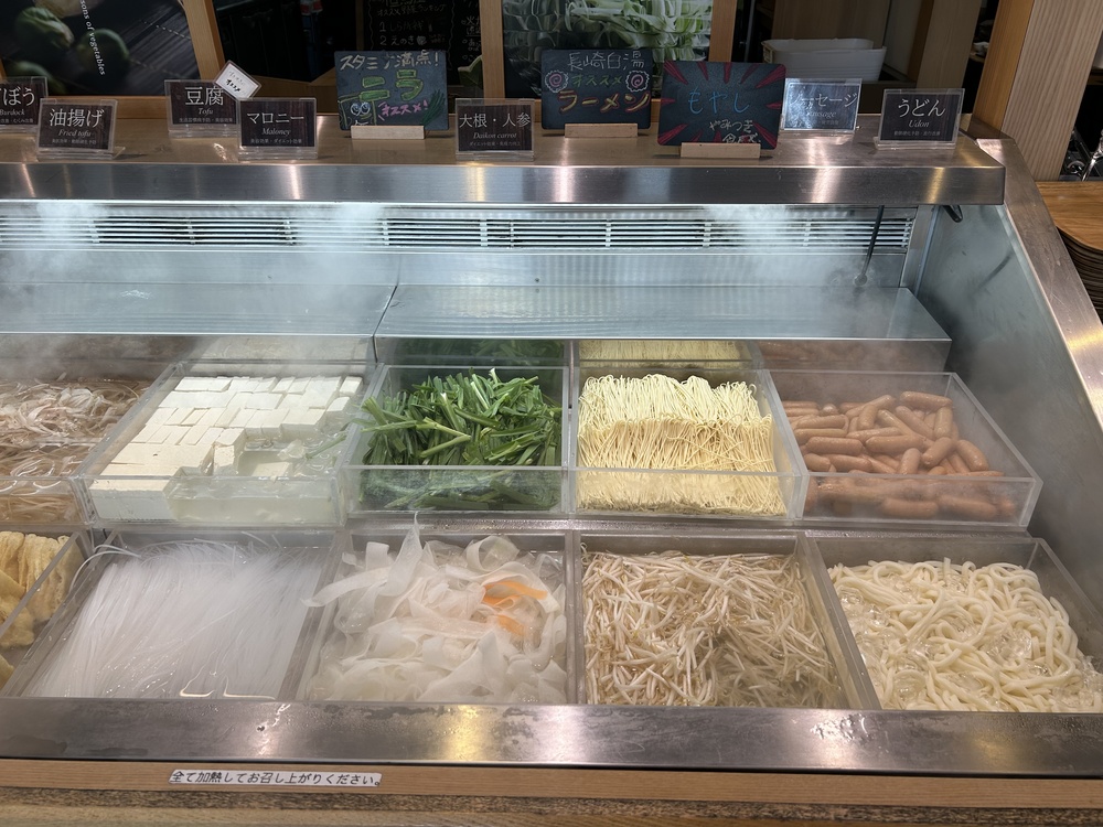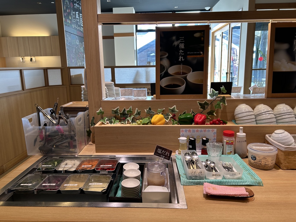 その隣には、たくさんのトッピングや漬物がキレイに並んでいます。