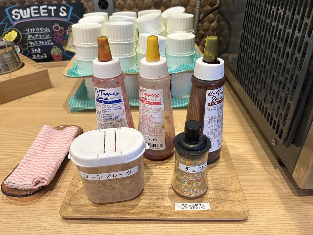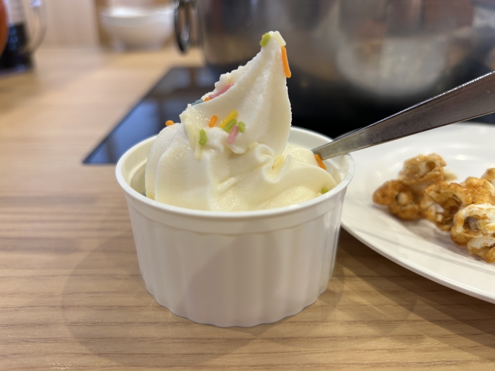 全て食べ終えてから、ソフトクリームとキャラメルポップコーンを持ってきました。