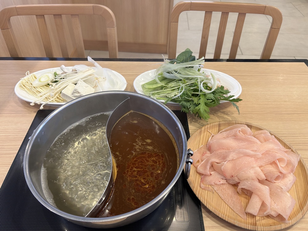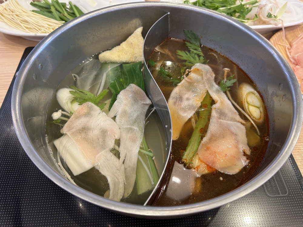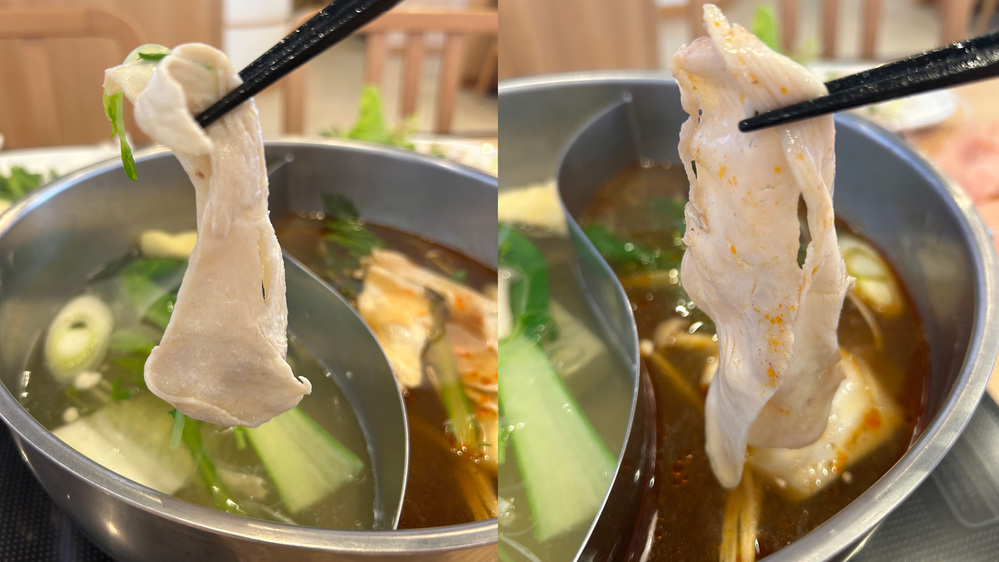 左が「かつお出汁」、右が「酸辣出汁」に、しゃぶしゃぶして取り出した時の比較です。右の方がラー油が絡んでいるのが分かりますね!どちらもおいしかったです。