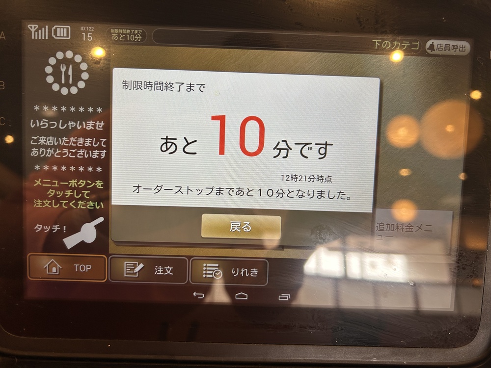 おいしい食事を楽しんでいたら、何やら音が!タブレットが時間を教えてくれました。