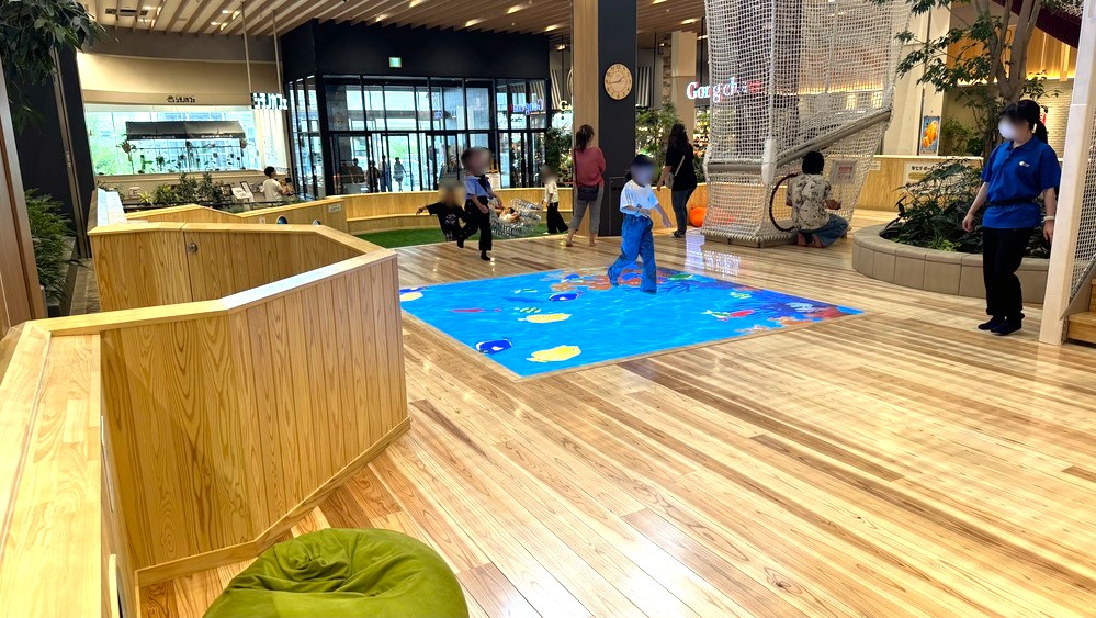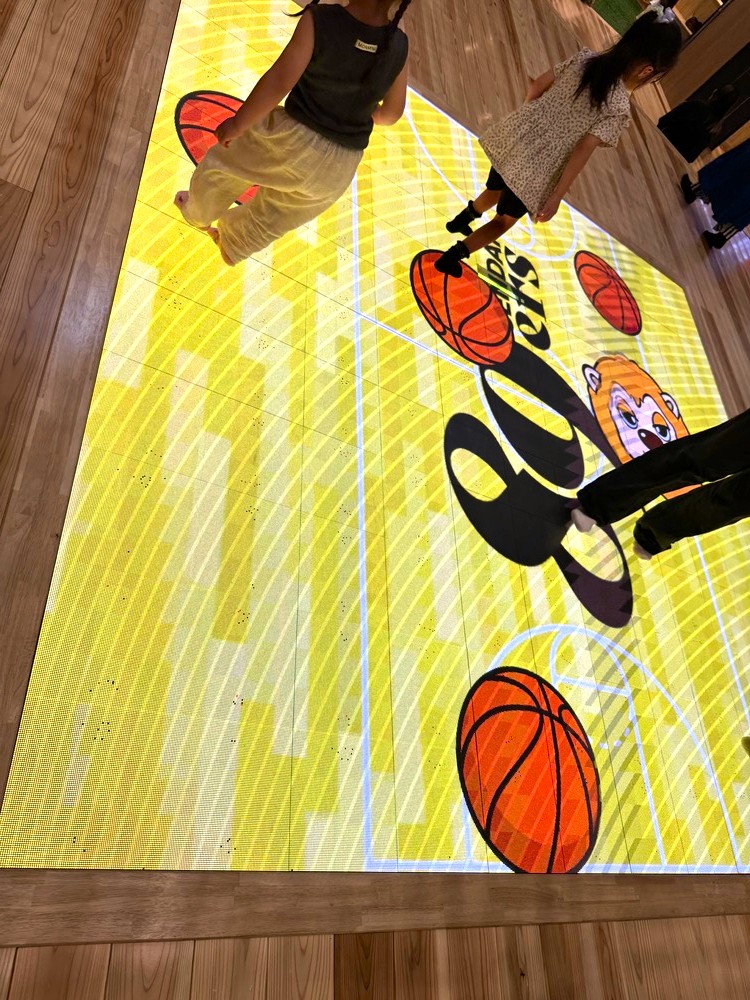 特に小さいお子さんたちに大人気の、9㎡の大きな床サイネージ。壁には6台の壁サイネージ♪