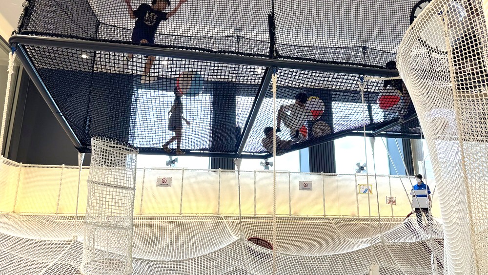 ネットの上から下にいる保護者を呼ぶ子や、ネットの上から床サイネージを見ている子など、自分なりの楽しみ方で空中ネットを満喫していますよ⭐︎