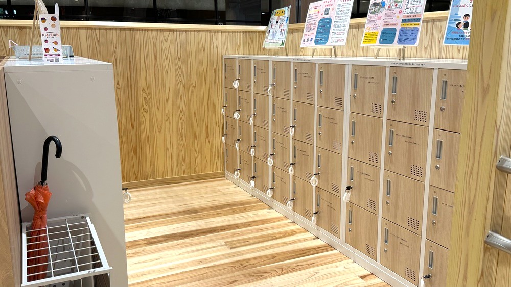 なとりぱーくの入り口を入ると下駄箱があり、その奥には鍵付きのロッカーもあるので、大きい荷物があっても安心して遊べます。