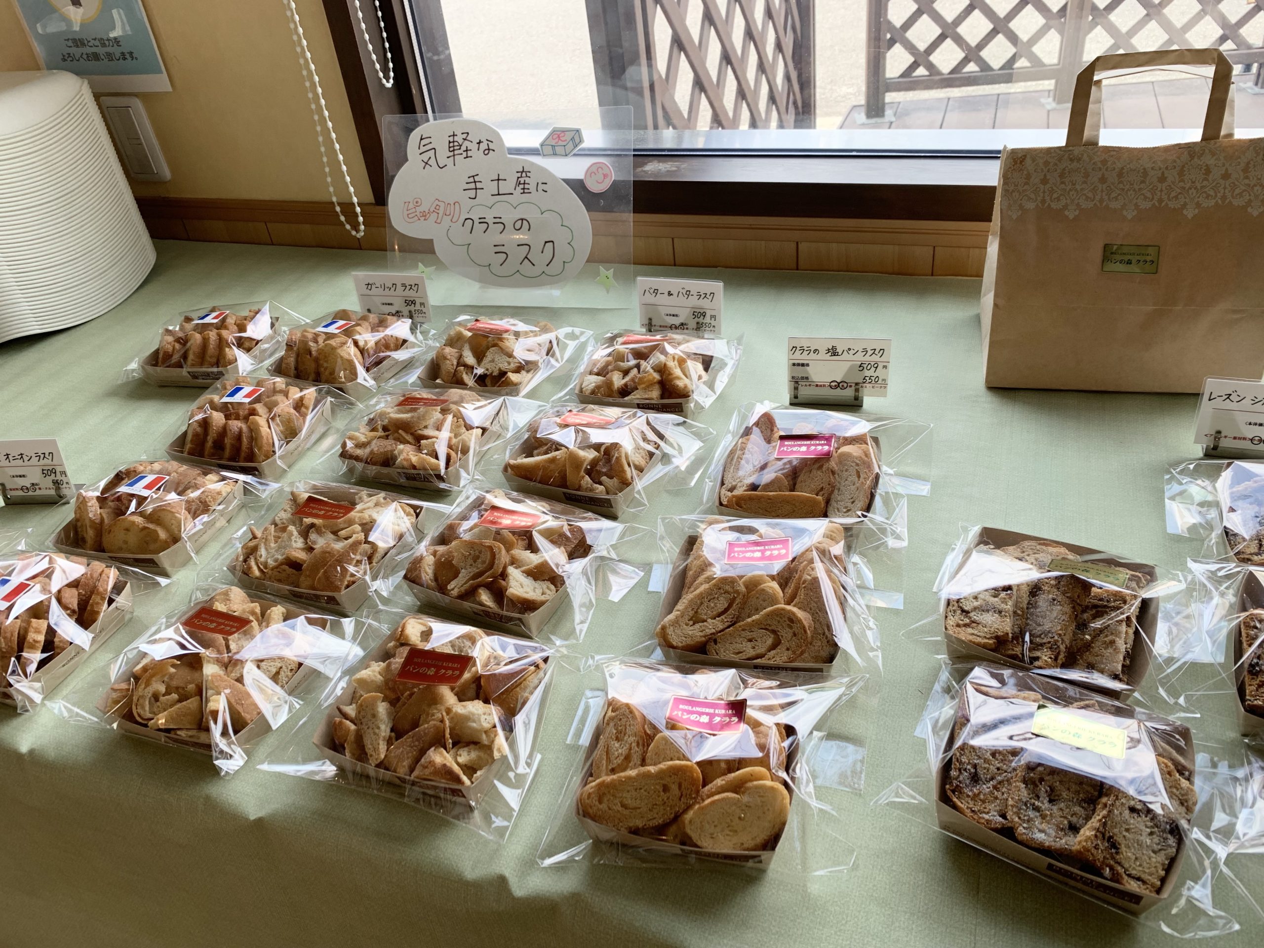 バターラスク、レーズン・シナモンラスク、ガーリックラスク、クララの塩パンラスクなど、こちらも種類豊富です。