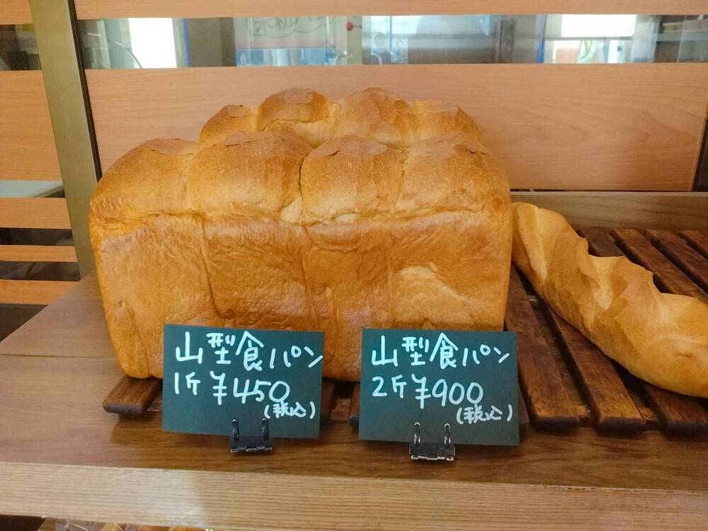 1つ目の人気商品は、山型食パン1斤(税込み450円)と山型食パン2斤(税込み900円)。ひとりで食べるには大きすぎたので、今回は購入できず…。