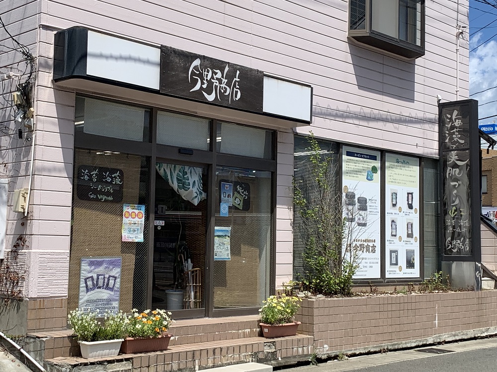 お店の前には、「今野商店」と書かれた大きな看板や、海苔・海藻を紹介するポスターが掲げられていて、とても目を引きます!