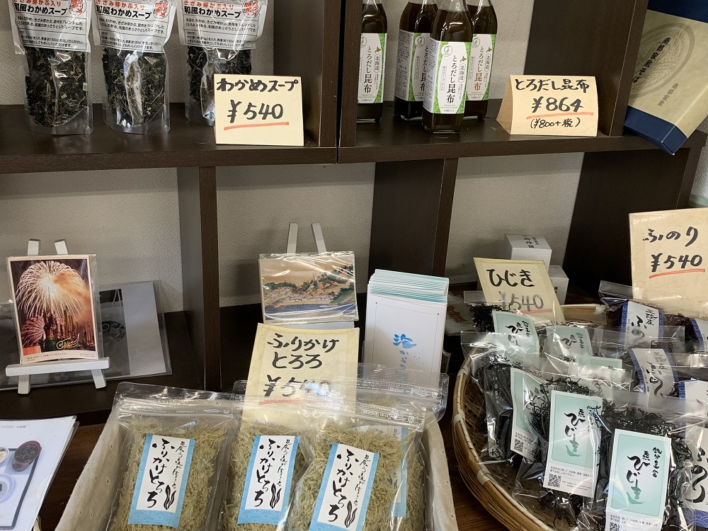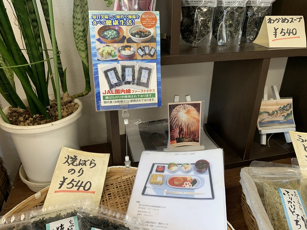店内の棚には、こだわりの海苔や海藻がずらりと並び、まさに海藻好きにはたまらない空間。