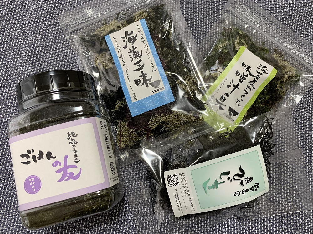 迷った末、今回は、味付けのり「ごはんの友」、「海苔屋がつくった味噌汁の具」、ミネラルたっぷりシーベジタブル「海藻三昧」、南三陸産の「乾燥ひじき」を購入しました。