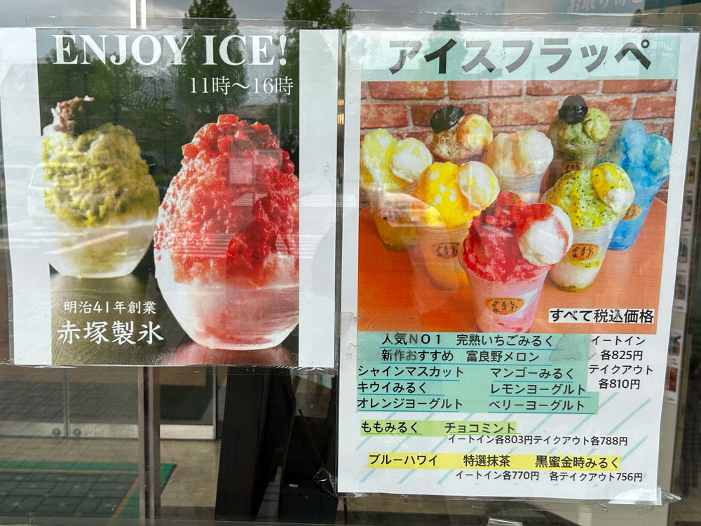 やっと決まったメニューは、ももミルクかき氷、人気No.1完熟いちごみるくアイスフラッペでした。