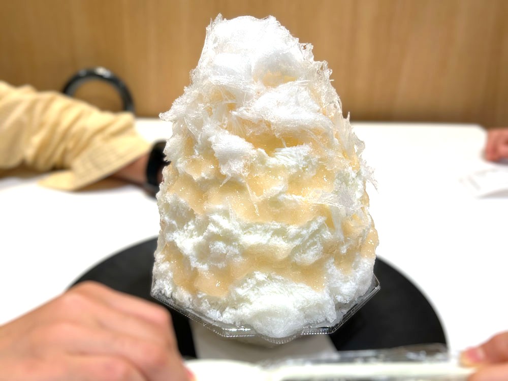 ももミルクかき氷の高さは大人の顔並みの大きさ。たっぷりかかった濃厚な桃のシロップとミルク。
