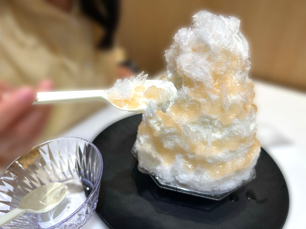 ももミルクかき氷は、9歳の娘と私が一緒に食べ始めますが、氷のきめ細やかさは雪のようで、スプーンを入れると、ふわりと軽く崩れてしまいます。