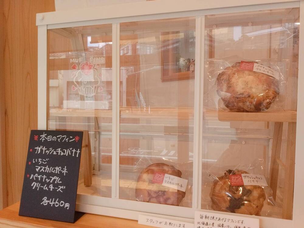 この日のマフィンは、ガナッシュチョコバナナといちごマスカルポーネ、パイナップルクリームチーズ(各税込460円)が陳列されていました。