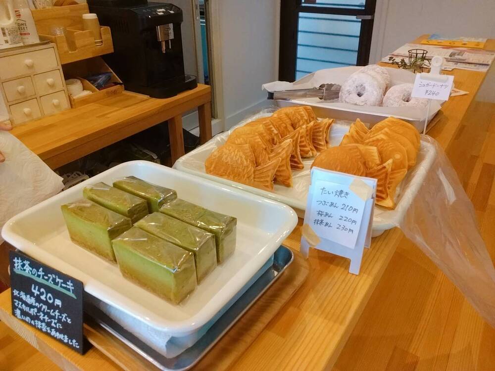 焼き菓子のある棚の右側には、抹茶のチーズケーキとたい焼き(つぶあん・桜あん・抹茶あん)、シュガードーナツが置いてあります。