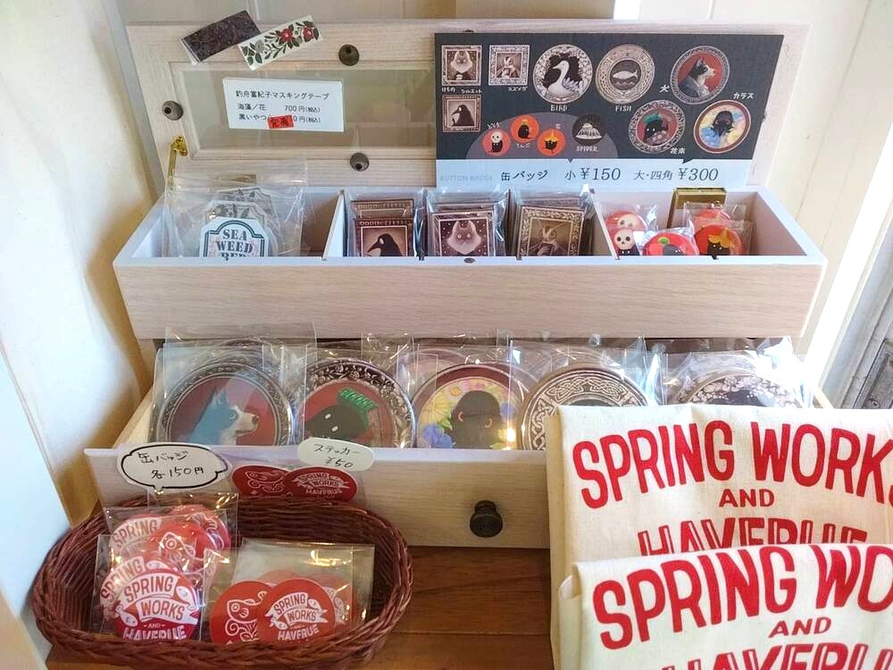 他にも店内には、娘さんが描いた作品の缶バッチやマスキングテープ、お店のロゴが入ったステッカーや缶バッチ、バッグなどが販売されています。